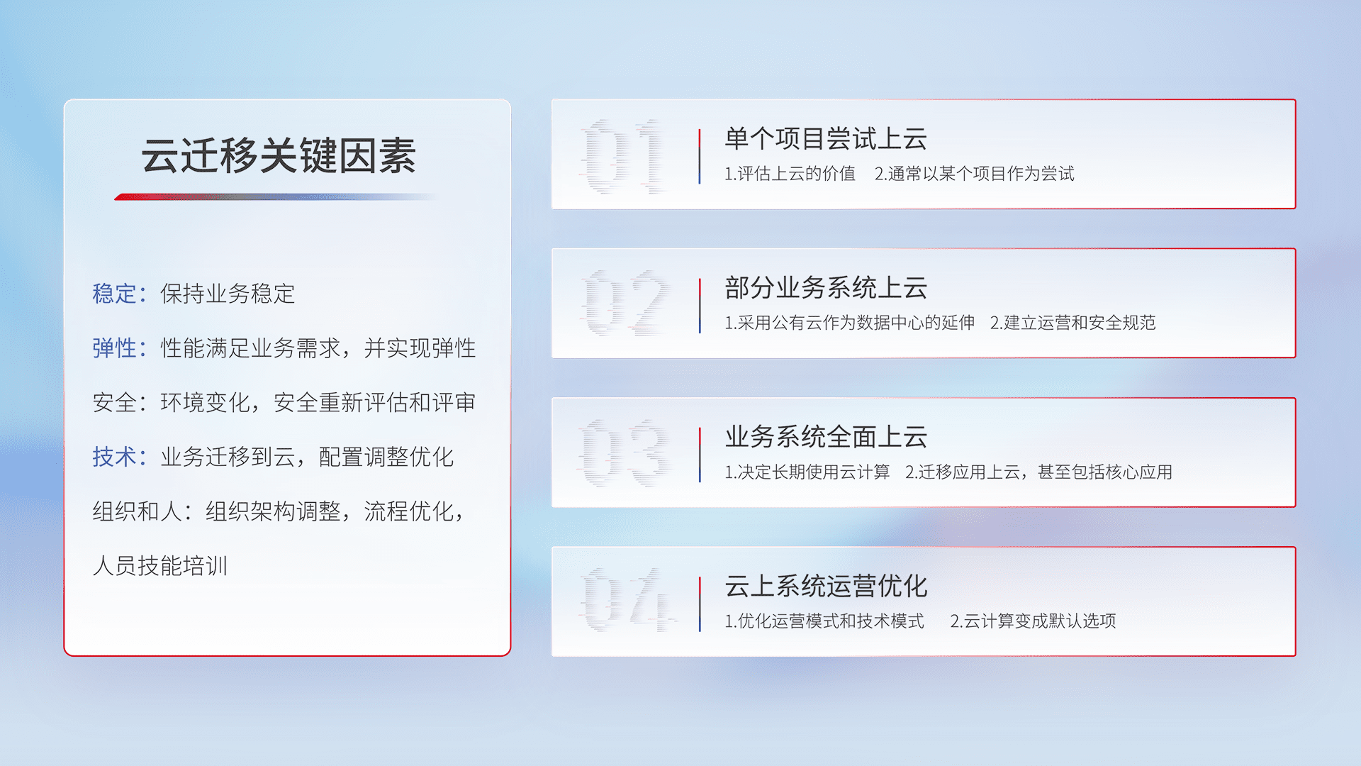结合实际业务,,,,从规划设计、、、云平台选型、、、、云原生改造、、、数据迁移、、、、集成交付,,,迁移全过程为客户识别最佳上云路径,,,,做好风险识别管理,,,设计网络架构、、、身份权限、、安全审计合规、、、操作审计、、日志审计、、监控告警策略、、多站点容灾设计等,,对云上基础设施进行整体规划,,提升IT治理水平,,,以满足弹性、、、、高可用、、、高性能的需求。。