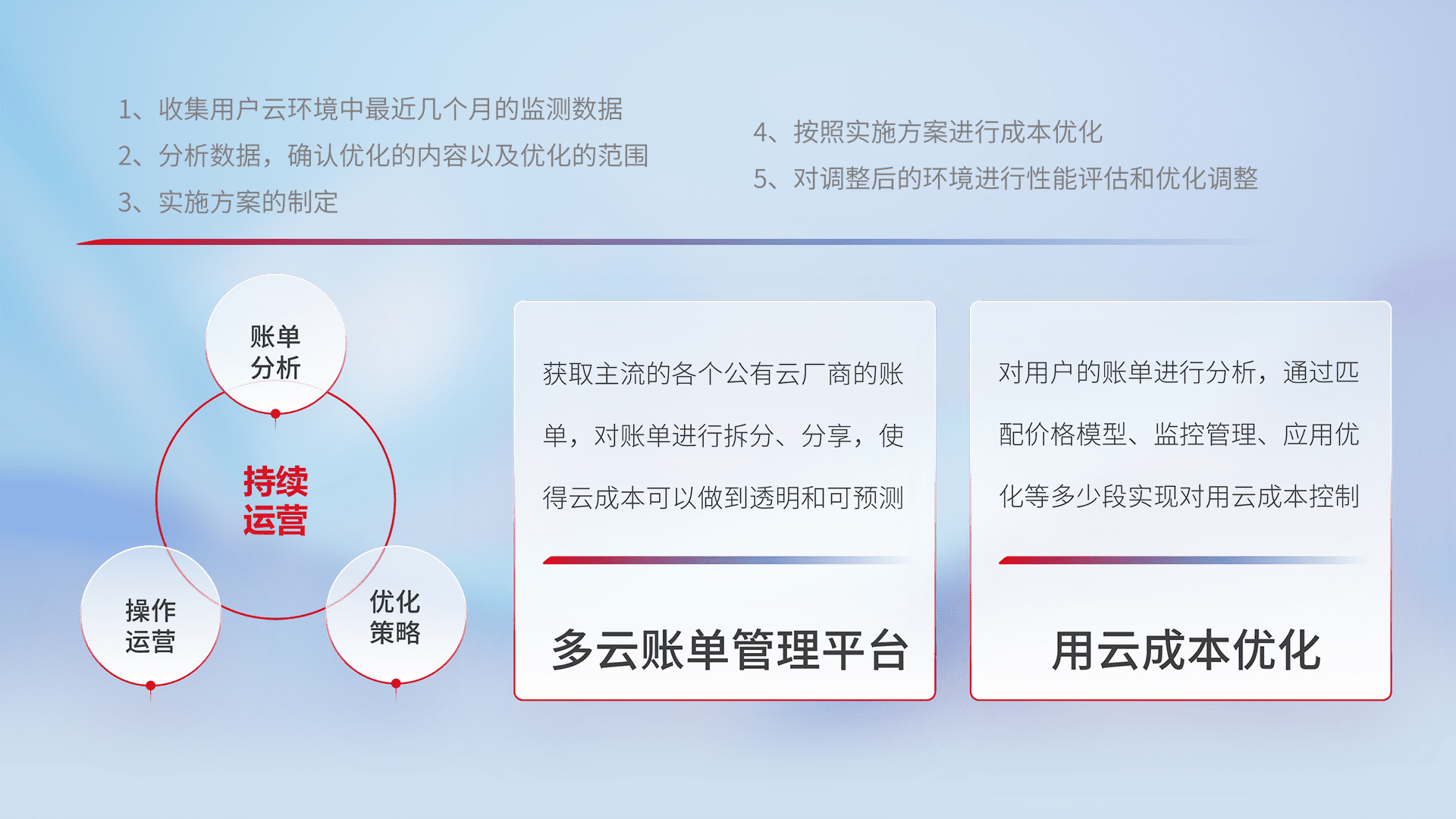 通过多云纳管,,,以统一的资源数据模型把客户的云资源进行抽象和封装,,进而实现对多云资源的统一操作,,,,保障云资源管理的可靠性、、稳定性与可用性。。。量身定制化运维内容,,,,配置、、、开发运维、、、补丁管理、、、、备份、、、、监控、、、、认证和访问管理、、、、审计和日常巡检等,,,保障在用云过程中的可靠度,,,,稳定度以及高可用率。。。